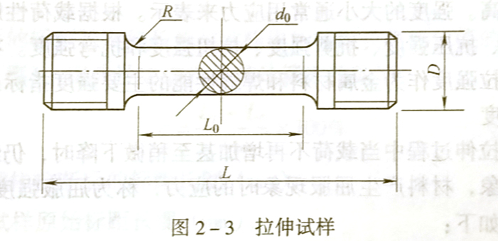 为了测得低碳钢强度、塑性等力学性能指标,科学家和工程师们对低碳钢进 行拉仲实验,并把这种实验制定成标准。钢的拉伸试样如图2-3所示。将加工好的试样在试验机上卡住两端大径部分,然后对其施加静拉力,试样产生拉长变 形 直至拉断,拉伸过程中的有关数据试验机进行显示,做好记录