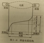 焊接电弧的结构,焊接电弧有哪几部份组成? 焊接电弧沿其长度方向分三个导电特点不同的区域,它们分别是阴极区、阳极区和弧柱区,如图1-4。焊接电弧就是由这3个区域组成的,见表1...