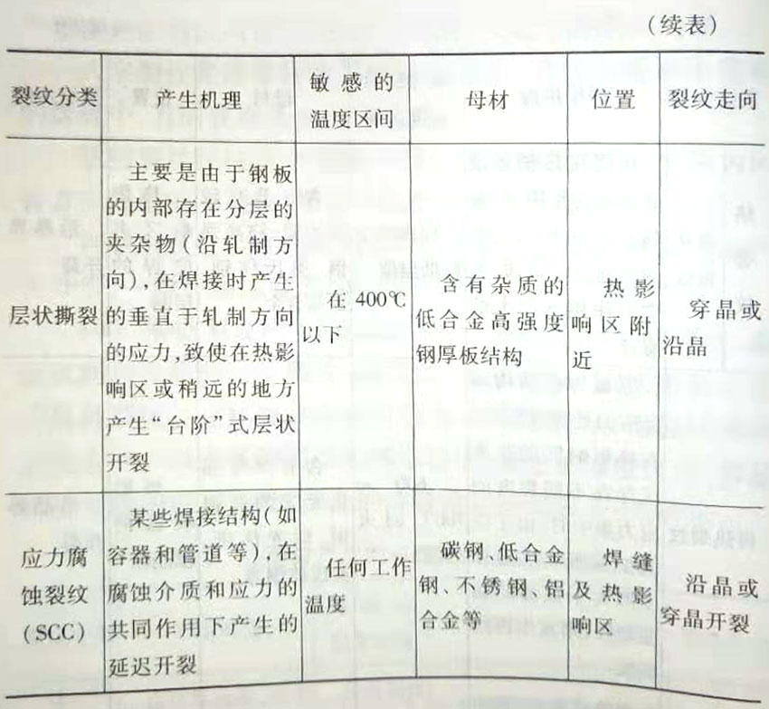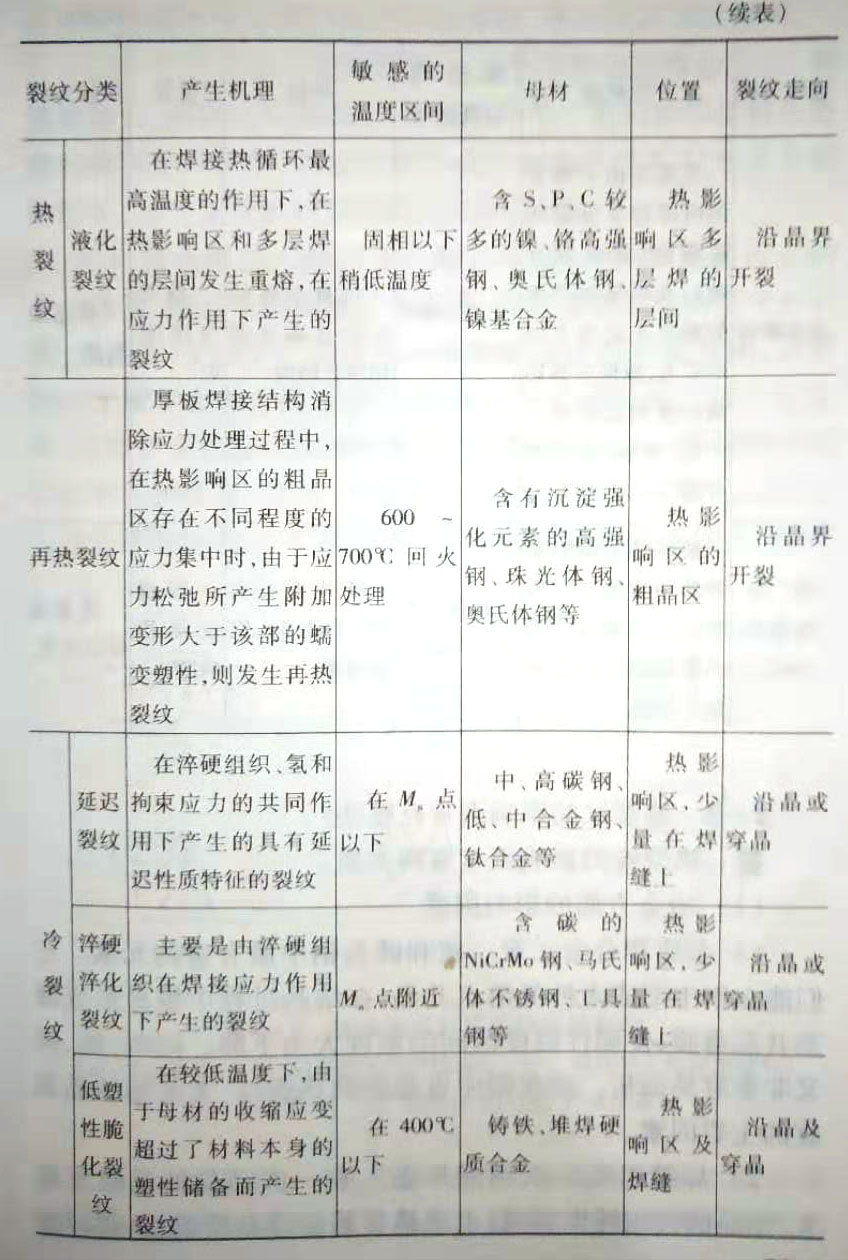 (4)根据裂纹产生的机理分类按裂纹产生的原因、温度区间和性质分有冷裂纹、热裂纹、再热裂纹、层状撕裂及应 力腐蚀裂纹。在热裂纹中还可分为结晶裂纹、液化裂纹和多 边化裂纹。以上各种裂纹的基本特征、敏感的温度区间、容易 产生裂纹的母材、裂纹产生的位置及走向见表2-1所示