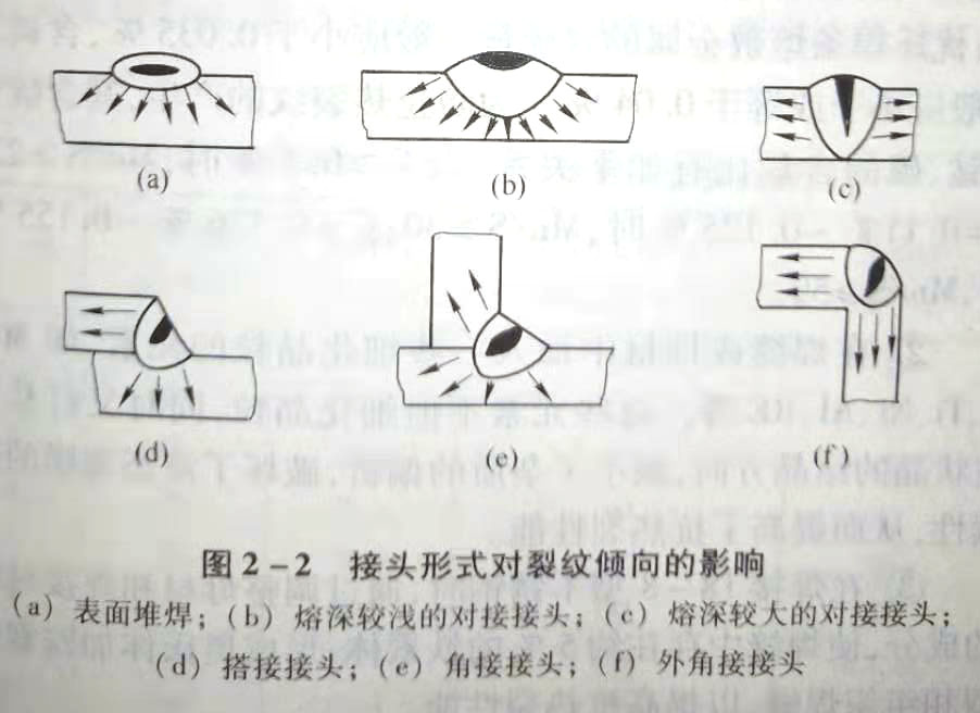 1)接头形式焊接接头形式不同,将影响焊接接头的受力状态、结晶条件和热的分布等,因而使热裂纹的倾向也不 同,如图2-2所示。表面堆焊和熔深较浅的对接接头,杂质倾向于聚集在靠近焊缝表层,与焊缝的收缩拉应力成一定角度,所以产生热裂纹的倾向较小,如图2-2a、b。熔深较大的对接和各种角接、搭接T形接头,因焊缝的收缩拉应力正好与杂质聚集的结晶面相垂直,所以热裂纹的倾向较大,如图2-2c、d、e、f所示。